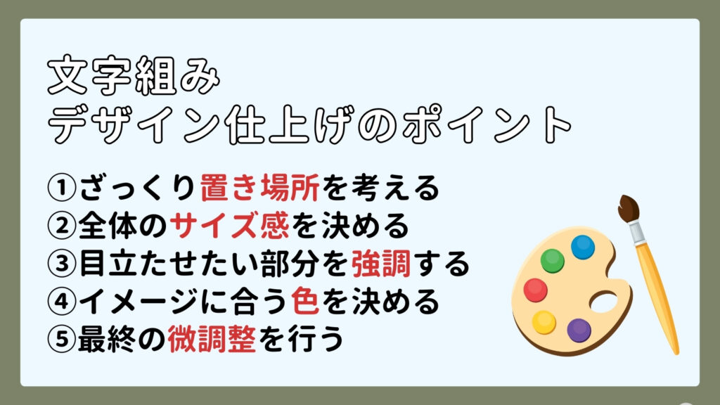 最後に文字間などを微調整して仕上げます。微調整の際には、画像を縮小して俯瞰して見るようにします。(俯瞰してみると、気づきがあります。)